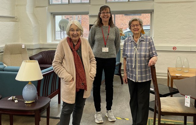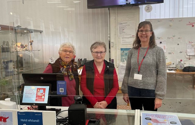 Monica sammen med sine fantastiske frivilligkollegaer, Danida på 82 år (tv). og Grete på 90 (th), som begge var med til at starte butikken for over 30 år siden. (Foto: Cecilie Batz)