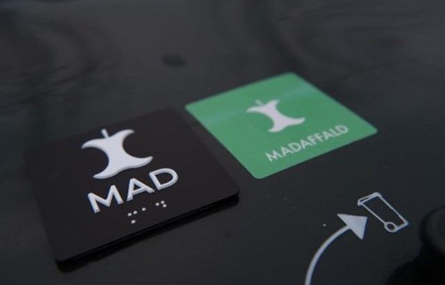 Skiltene viser piktogrammer for forskellige affaldstyper, men som noget særligt er de taktile, det vil sige, at symboler og bogstaver stikker frem og kan føles med fingrene.