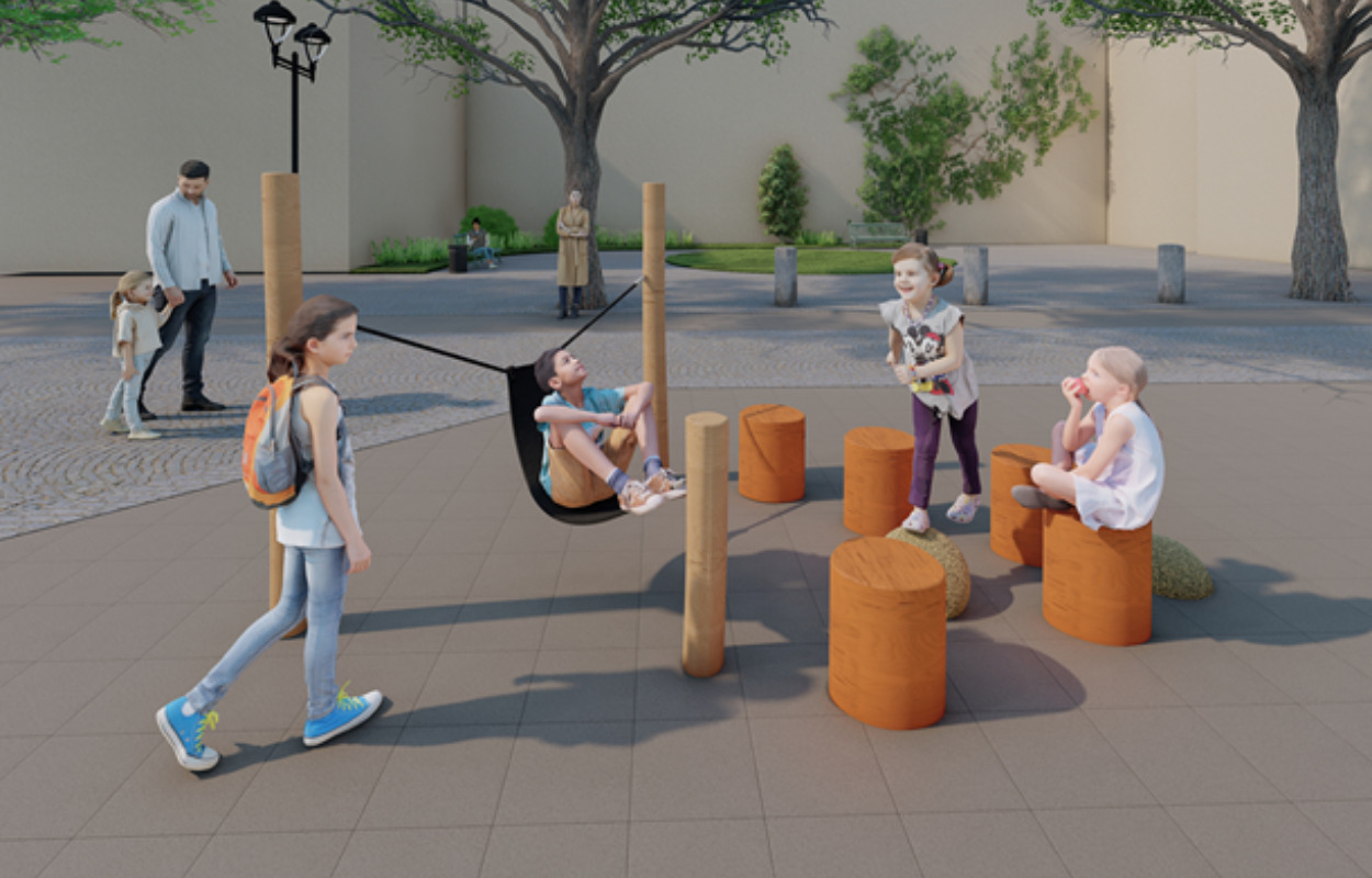 Den tredje og sidste legestation skal ligge ud for Jernbanegade 5 og kommer til at rumme balance-pæle i forskellig højde og hænge-ud-køjer, som man både kan ligge i og sidde på.